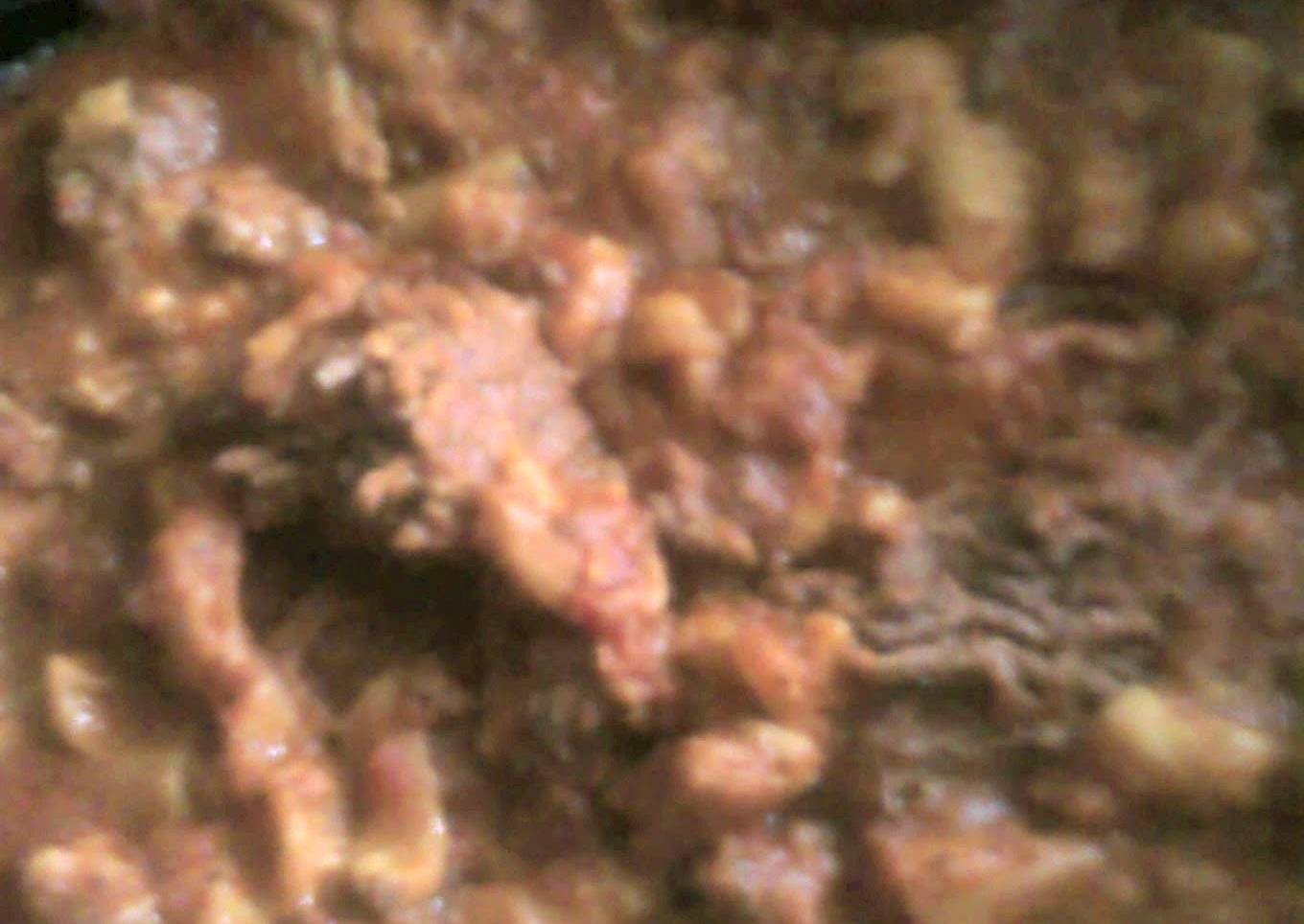 - When the meat has browned and lentils have begun to dissolve, add tomatoe, and pasta sauce, oil, and vegeta stock