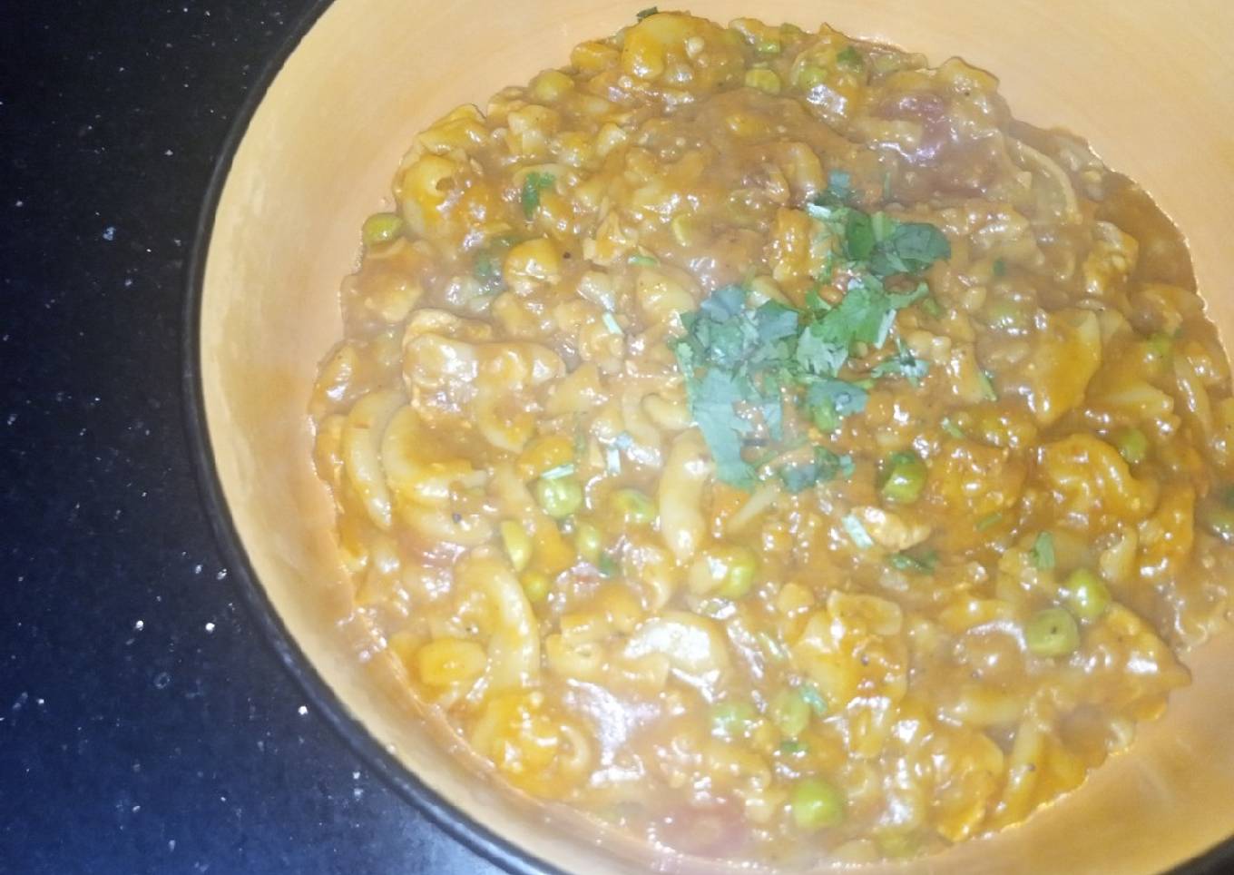 Pasta,chicken and vegetables are cooked together in a sauce along with flavorful spices and served hot.
