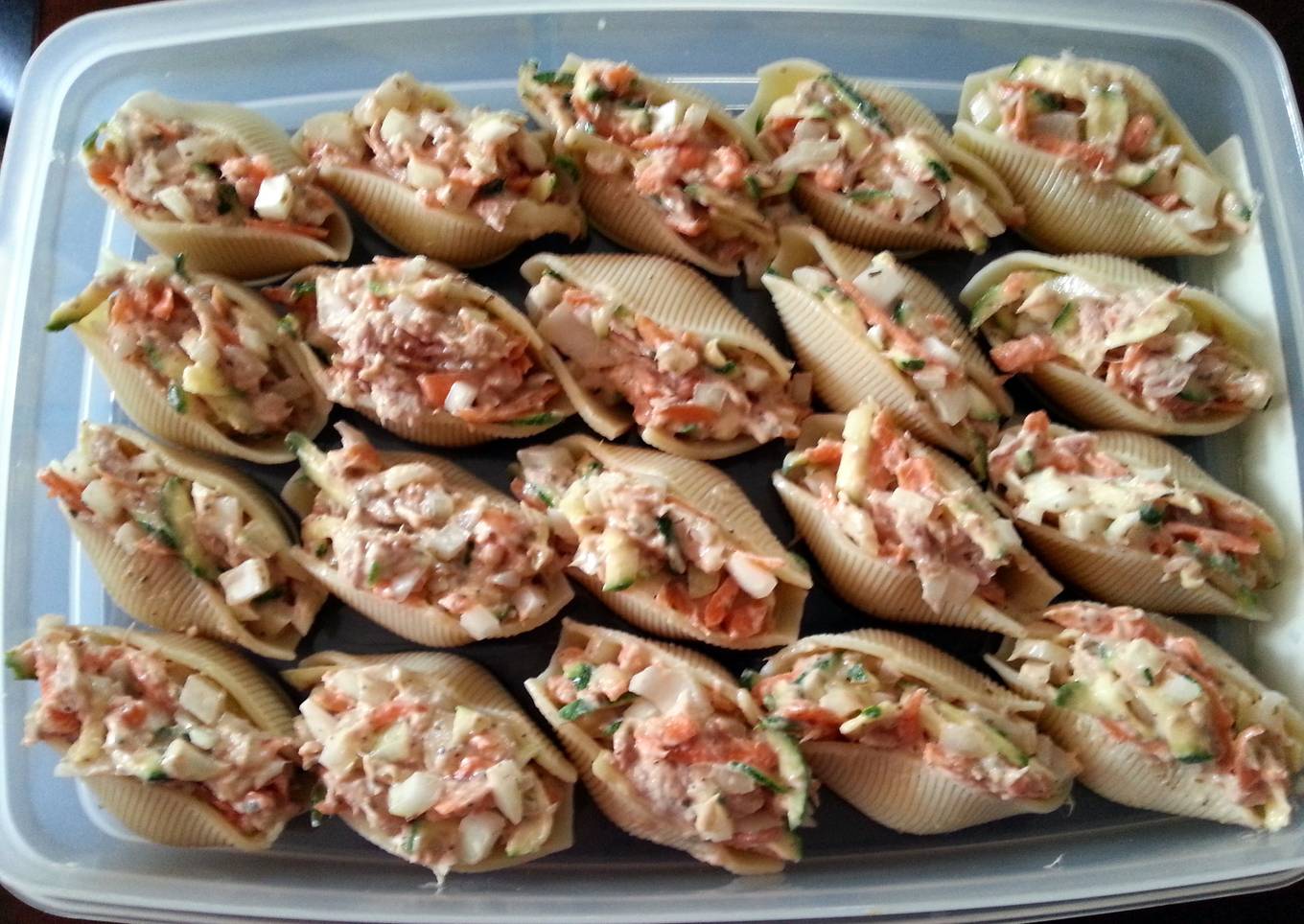 - Mix mayonnaise, basil, and salt in medium bowl. Stir in tuna, carrot, zucchini and onion until evenly mixed. Drain pasta. Rinse with cold water; drain. Fill each pasta shell with 1 tablespoon tuna mixture and top with 1/2 tablespoon of Tomato-Basil Vinaigrette.