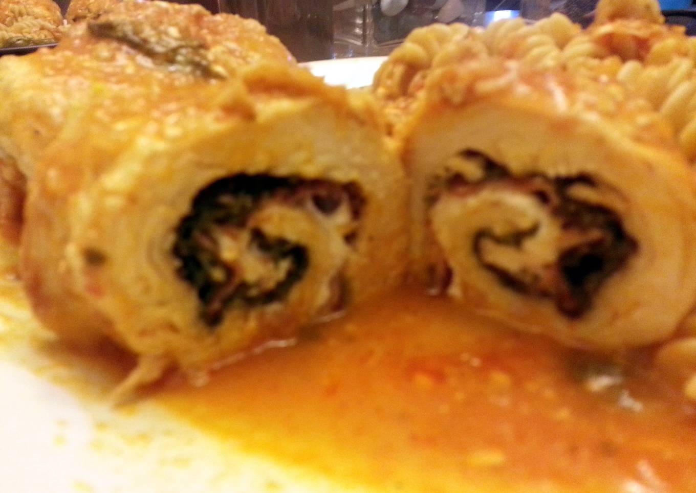 - Add spinach then prosciutto then cheese. Roll tightly from bottom to top and toothpick to hold in place.
