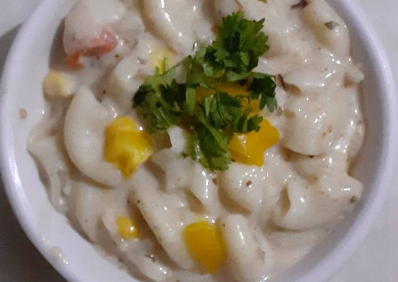 - To make pasta In the white sauce add in the capsicum, bell pepper, and corn and then add in boiled pasta. Then add in paprika and pasta seasoning. Now your cheesy white sauce pasta is ready to be served. Serve it by putting some cheese on top