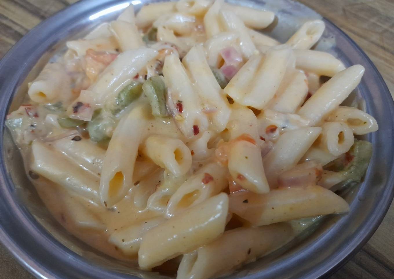 - Now add tandoori mayonnaise, milk and let it boil for a min now add oregano and Chilli flakes now add boiled pasta cook till sauce become lil bit dry and at last add cheese as much as you like